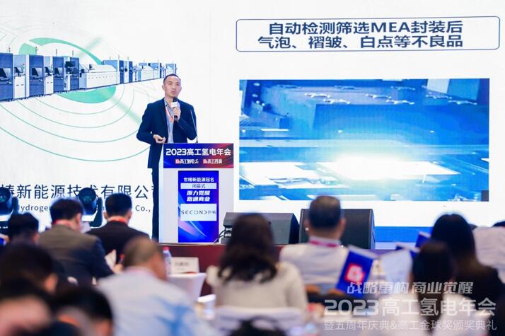 本次峰会得到了众多氢能与燃料电池产业链优秀企业的倾情支持,他们通过多元化的形式展示各自在技术变革、产能布局、产品创新、市场开拓等方面的最新进展。世椿新能源销售总监许昌在《乘氢能源东风,装备顺势而为》主题演讲中介绍,在氢能源东风的吹拂下,世椿新能源顺势而为,前瞻性把握行业发展方向,提前布局,研发出应用于氢能及燃料电池行业的高速度、高精度、高可靠性智能制造装备:双极板自动封装线、膜电极自动封装线、自动/半自动装堆机、双极板/膜电极气密测试线、双极板/膜电极瑕疵检测线、电堆/系统组装线、PEM电解槽装堆线等,以及核心工艺解决能力:膜电极封装工艺解决能力、双极板封装工艺解决能力、电堆/系统组装工艺解决能力、电解槽生产工艺解决能力等,为国内外近100家燃料电池企业提供项目生产设备,大大提高了生产效率和自动化生产水平,推动氢能产业的高质量和可持续发展。